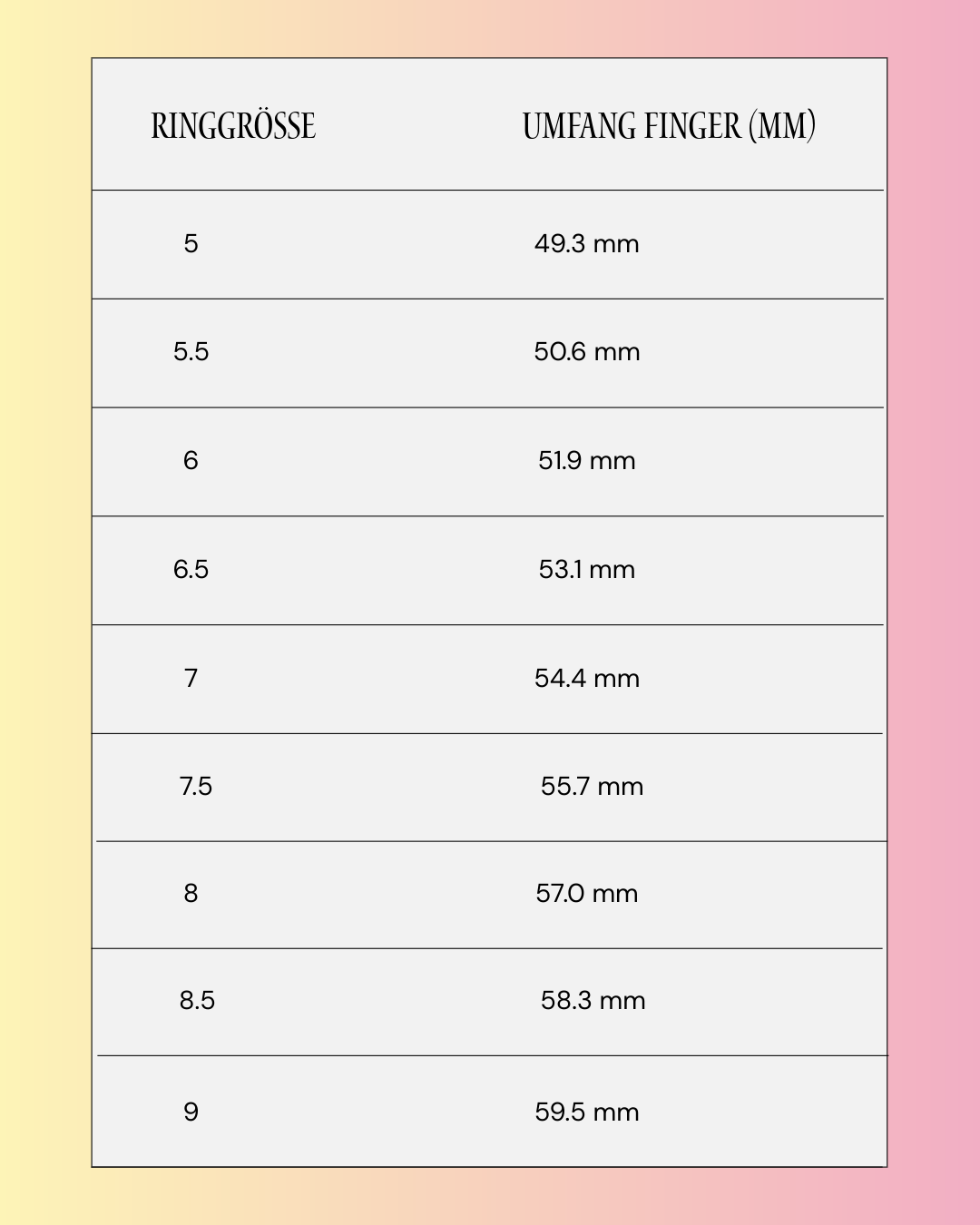 ♡ Vergleiche den Wert mit der Tabelle, um deine Ringgrösse zu finden.